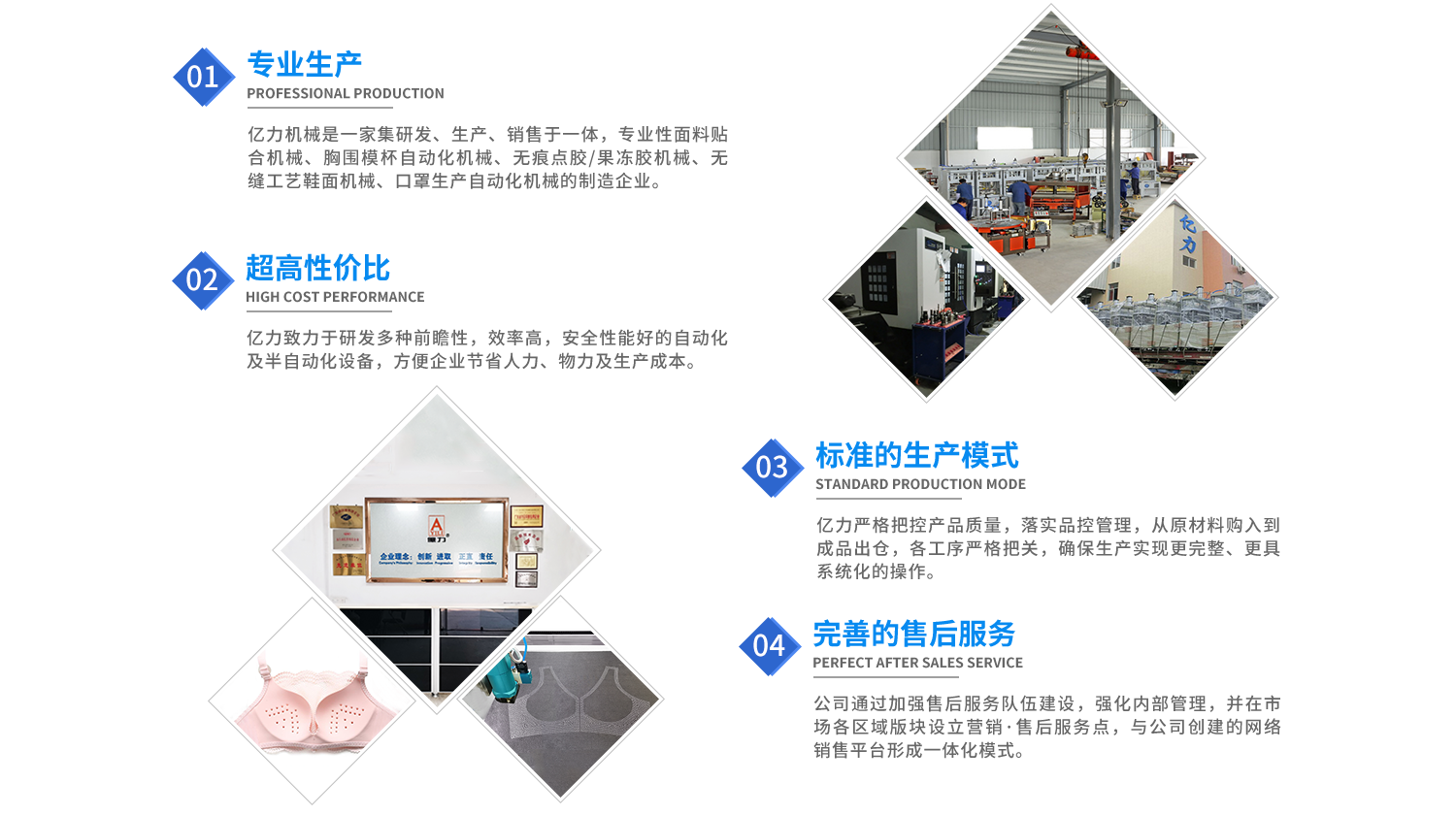 汕頭市億力機械設備有限公司網站正式上線! 汕頭市億力機械設備有限公司是一家集研發(fā)、生產銷售于一體的專業(yè)性面料貼合機械、胸圍模杯機械、無縫工藝鞋面機械、口罩生產線和焊耳帶機械企業(yè)。